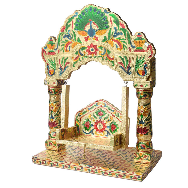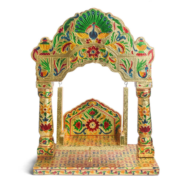 meenakari laddu gopal jhula | royal darbar kanha ji swing | singhasan style krishna swing | meenakari pooja essentials | temple swing for laddu gopal | traditional krishna jhula | satvikstore kanha jhula | decorative krishna swing | gold metal pooja swing