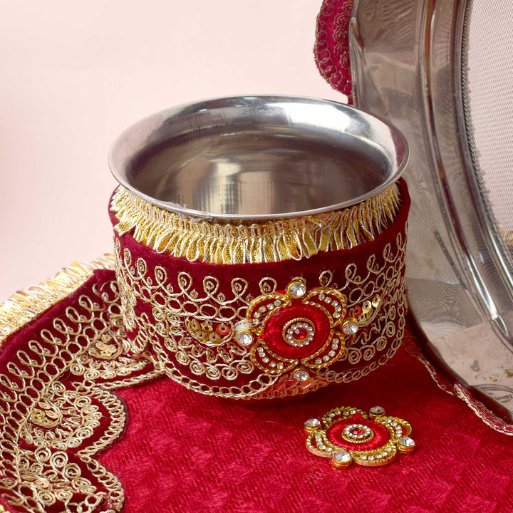 Item Name: 11 Pc Maroon Embroidery Karwa Chauth Thali Set with Cover – Complete Puja Kit