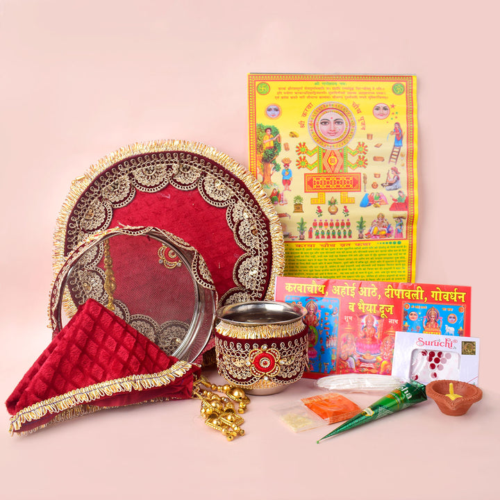 Buy Maroon Embroidery Karwa Chauth Thali Set 11 Pc | Satvikstore.in – satvikstore.in