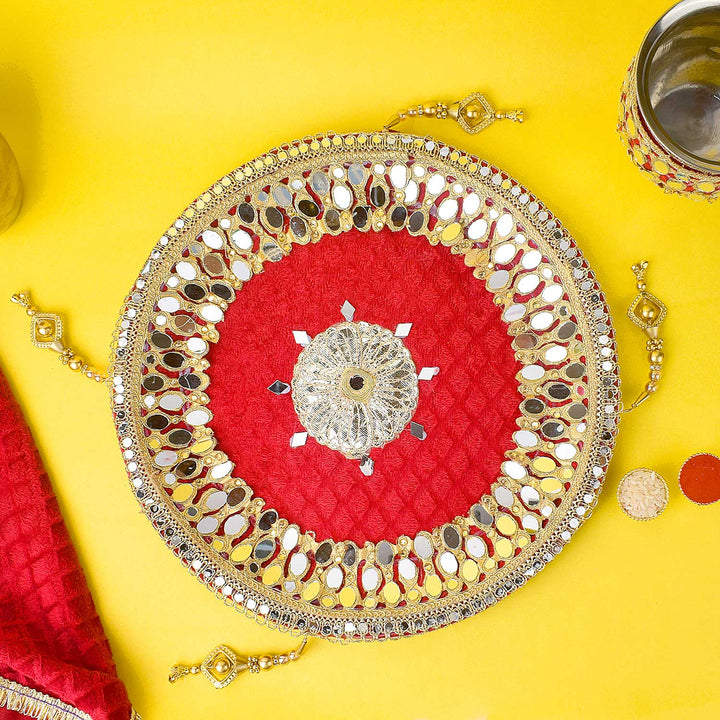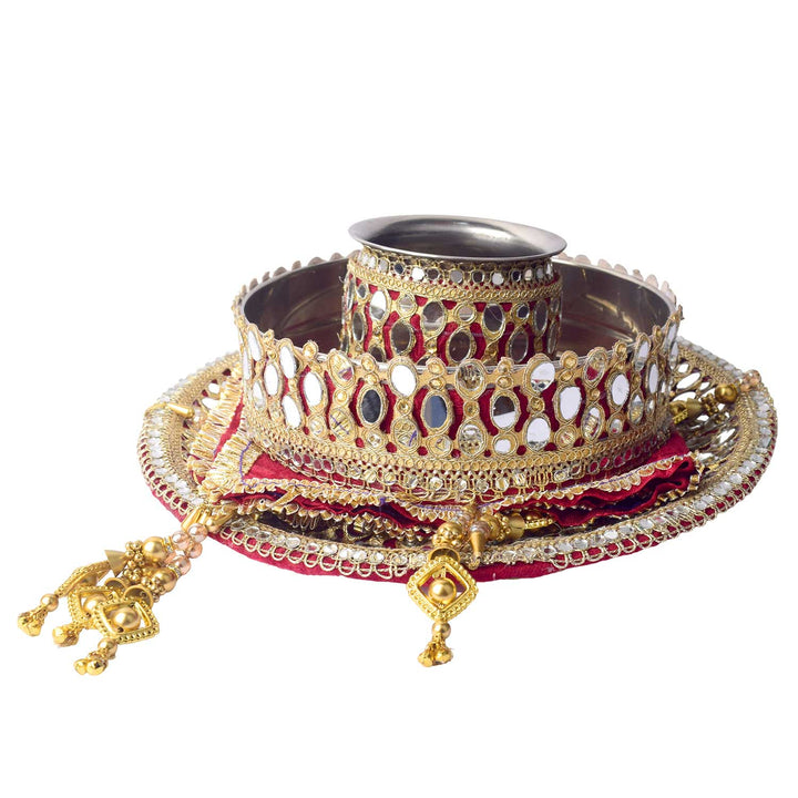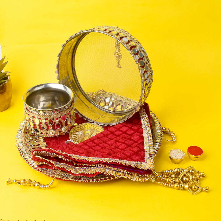 Shop Maroon Mirror Work Karwa Chauth Thali Set 11 Pc | Satvikstore.in – satvikstore.in