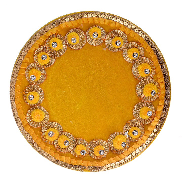 Item Name: 11 Pc Yellow Pompom Karwa Chauth Thali Set with Cover