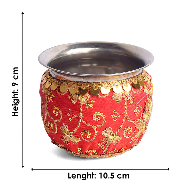 Design: Beautiful Handcrafted Designer Karwa Thali with Fabric all over the Thali and Lace Work all over the Lota and Sieve (Channi), Which makes it more Attractive.