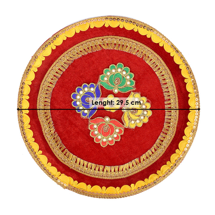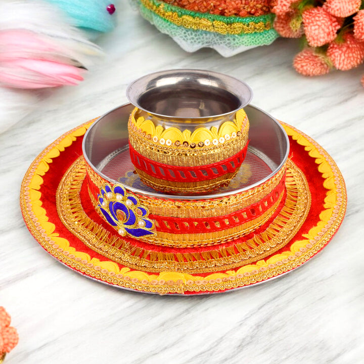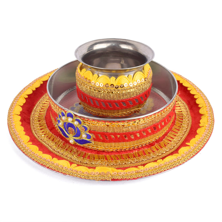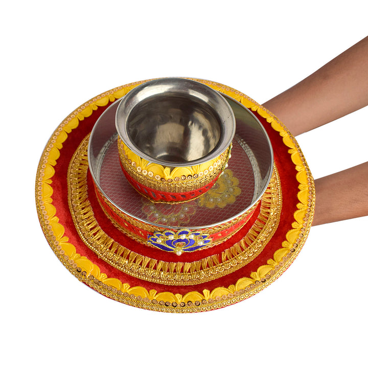 Exquisite Red Gota Patti Karwa Chauth Thali Set -3pc