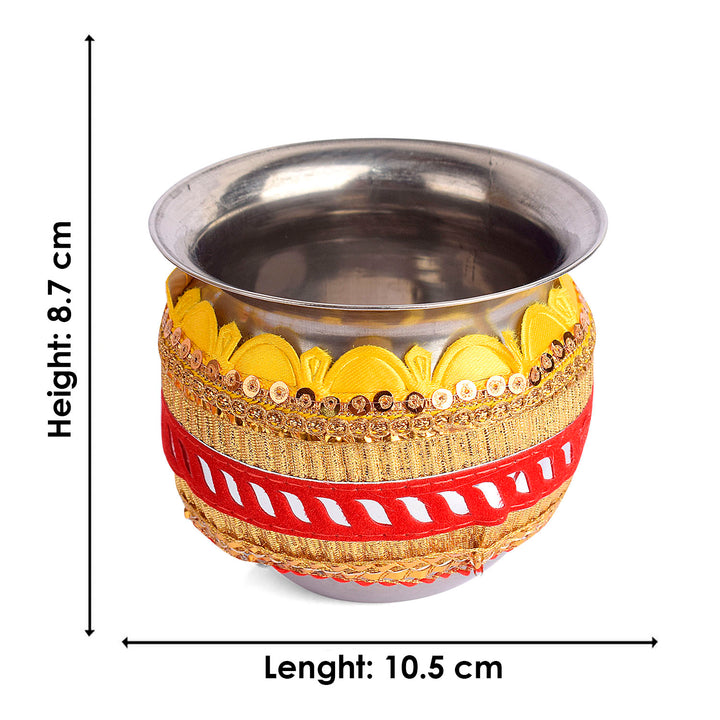 Design: Beautiful Handcrafted Designer Karwa Thali with Fabric all over the Thali and Lace Work all over the Lota and Sieve (Channi), Which makes it more Attractive.