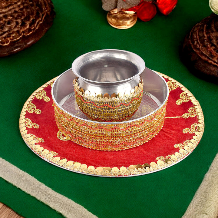 Handcrafted Elegant Red Karwa Chauth Thali Set of (3pc)