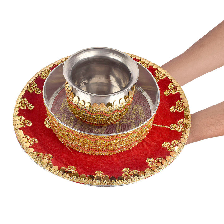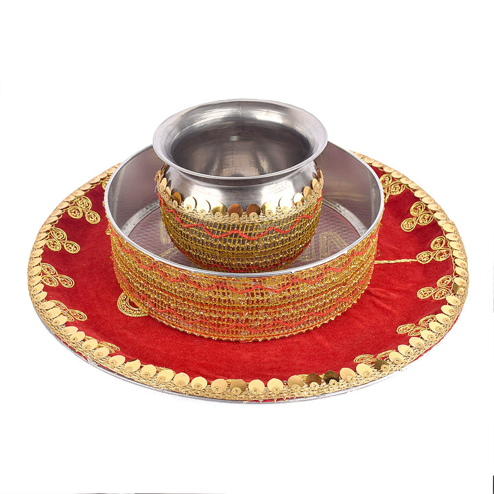 Item Name: Handcrafted Elegant Red Karwa Chauth Thali Set of (3pc)