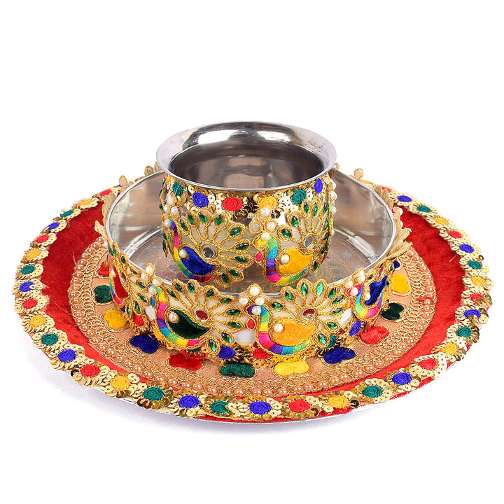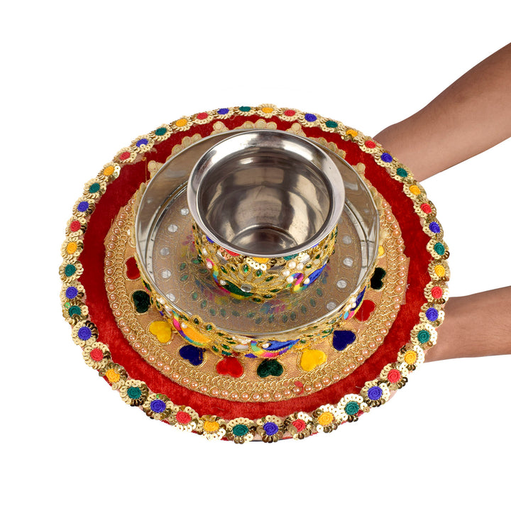 Item Name: Handcrafted Red and Gold  Karwa Chauth Thali Set-3pc