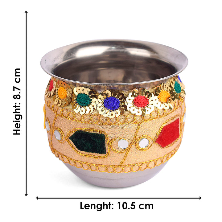Design: Beautiful Handcrafted Designer Karwa Thali with Fabric all over the Thali and Lace Work all over the Lota and Sieve (Channi), Which makes it more Attractive.