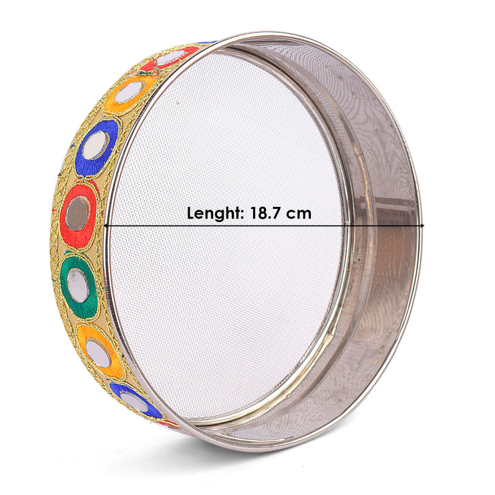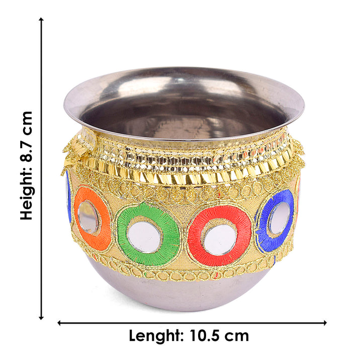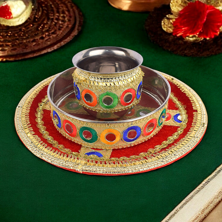 About Product: Karwa chauth beautiful Steel thali set includes a thali, Lota, Sieve for traditional and trendy way of karwa chauth pujan for all the married / engaged ladies and girls. Be attractive by using such a decorative piece of thali of puja for your love/ life. This thali can also be used on Diwali/ Deepawali Pujan. Karwa chauth thali set, karwa chauth thali, karwachauth thali platter, karvachauth thali platter, pooja thali set, steel puja thali set, complete karwachauth set, karwachouth set, designer thali set,hanmade thali set, Indian traditional set, karwachauth thali.