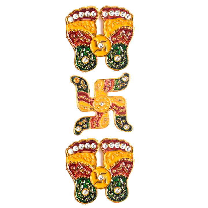Shubh Labh Leaf With Swastik Wooden StickerPackage Contains: 1 Pair of Charan Paduka and 1 Swastik Sticker