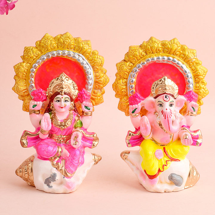 • Product Details: Material: Clay Dimensions: Ganesha: Height: 12.5cm, Length: 6.5cm, Width: 5.7cm, Laxmi: Height: 12.5cm, Length: 7.5cm, Width: 5.7cm, Total weight: 465gram, Finish Type: Glossy.