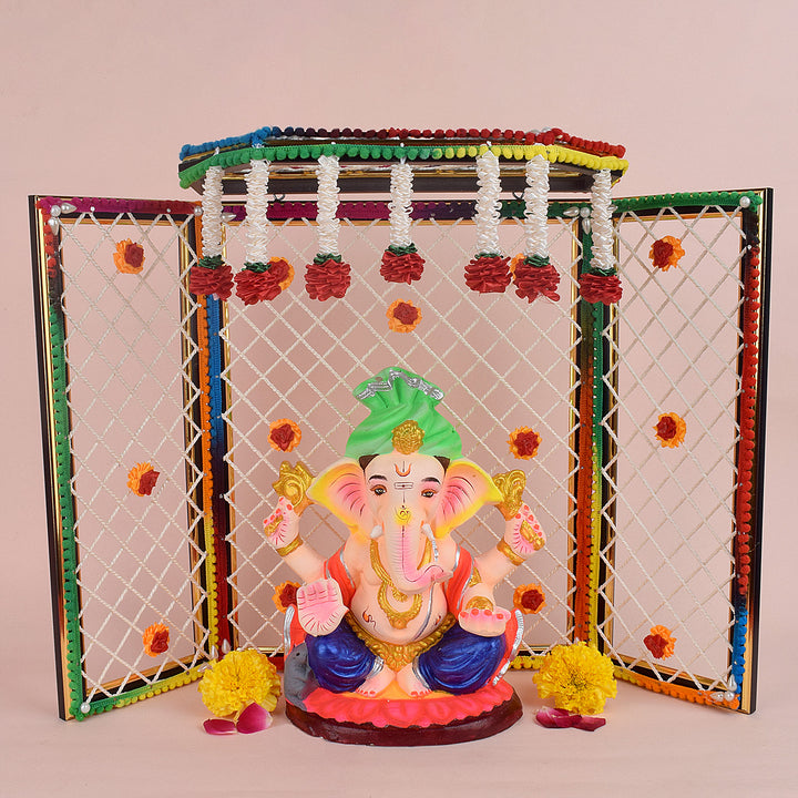 15 inch Ganesh backdrop | Multicolor Phool Bangla | Ganpati decoration stage | Large Ganesh flower bangla | Eco-friendly Ganesha decor | Ganpati mandap background | Festive Ganesha floral setup | Artificial flower bangla for idol |