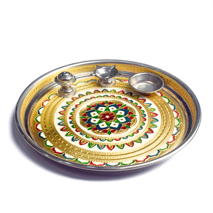 Buy Our Elegant Steel Printed Pooja Aarti Thali Set | Satvikstore.in – satvikstore.in