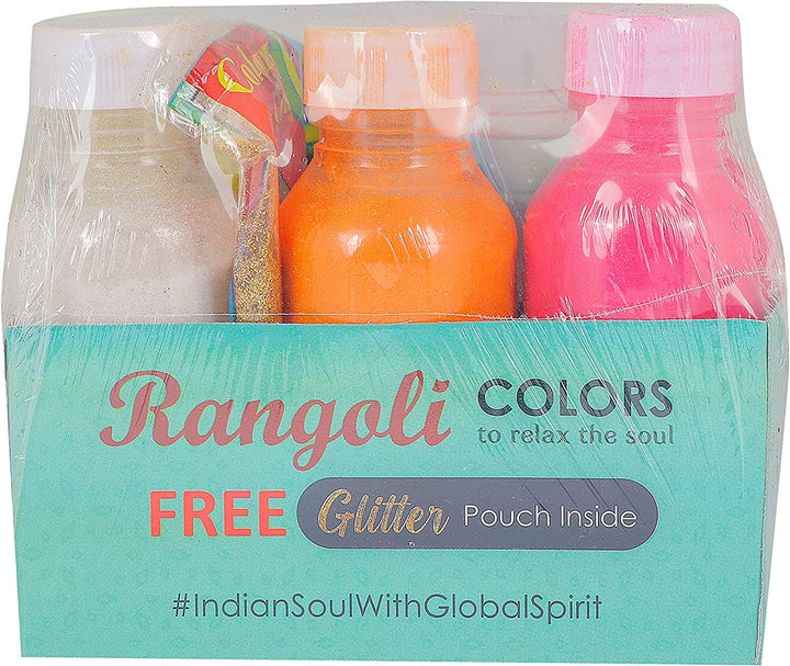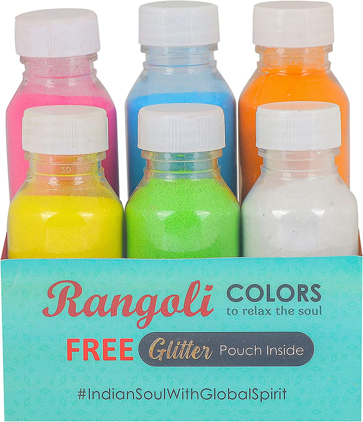 • Package Content: 6 Pc Set of Water Floating Rangoli Colors Bottle with 1 Pouch of Glitter and With 1 Nossel. Each Bottle having Grams Color.