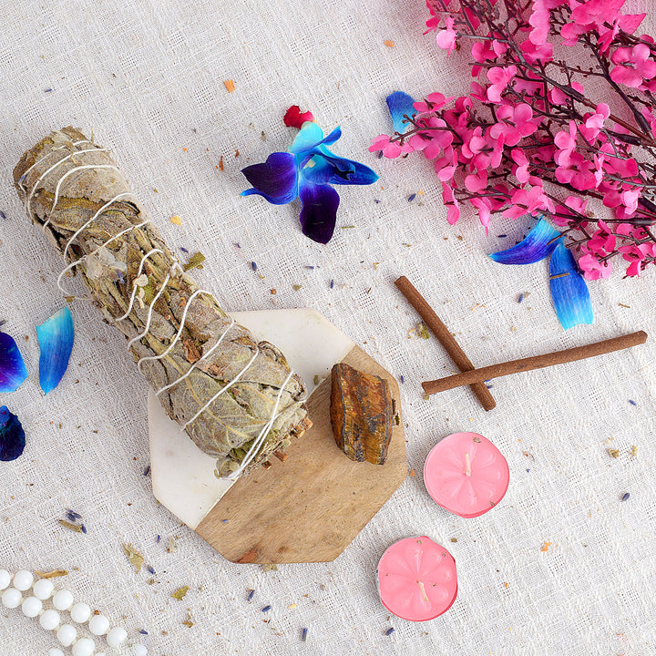 • About Product: We at Satvikstore.in Introducing our captivating Mexican Incense Sage with Tiger Eye Crystal Healing Smudge. Immerse yourself in the aromatic journey of Mexican incense sage while harnessing the grounding and protective energy of tiger eye crystal. This powerful combination purifies your space, enhances courage, and promotes balance. Elevate your rituals with our handcrafted smudge, meticulously made for superior quality. Experience the transformative benefits of Mexican Incense Sage with Tiger Eye Crystal Healing Smudge and invite strength, confidence, and positive energy into your life. Create a sacred space that empowers and inspires you.