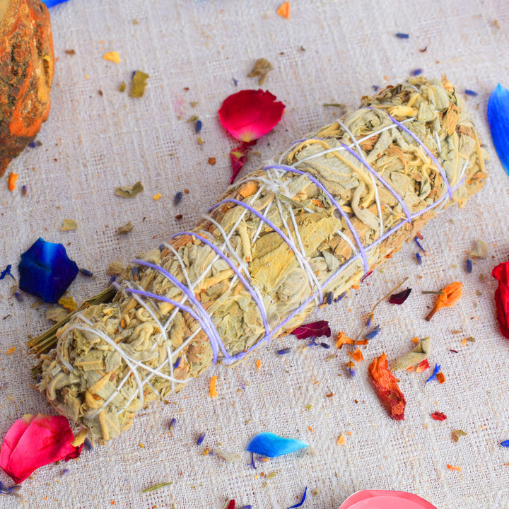 • About Product: We at Satvikstore. immerse yourself in the tranquil energy of White Sage combined with Lavenders and Clear Quartz Crystal Healing Smudges. This exquisite smudge bundle creates a serene ambiance, purifying negative energies and promoting clarity. White Sage clears the space, Lavenders infuse a soothing aroma, while Clear Quartz Crystal enhances spiritual healing. Perfect for meditation, energy cleansing, and sacred rituals.