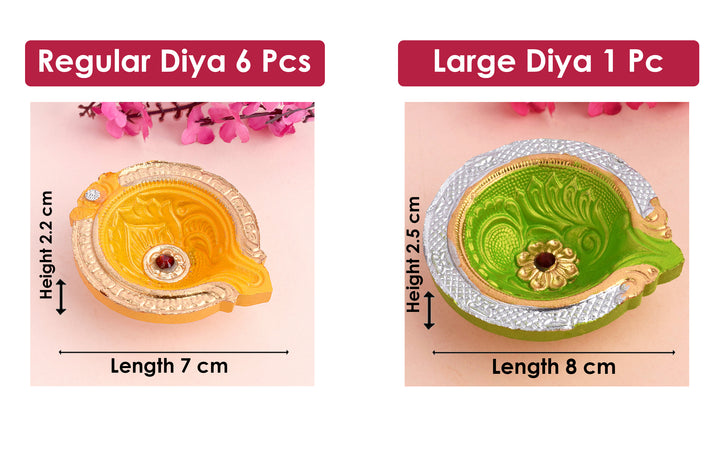 • Product Details: Material: Clay/Terracotta Dimensions: Regular Diya Height: 2.2cm, Length: 7cm, Large Diya Height: 2.5cm, Length: 8cm, Weight: 700gram, Finish Type: Glossy.