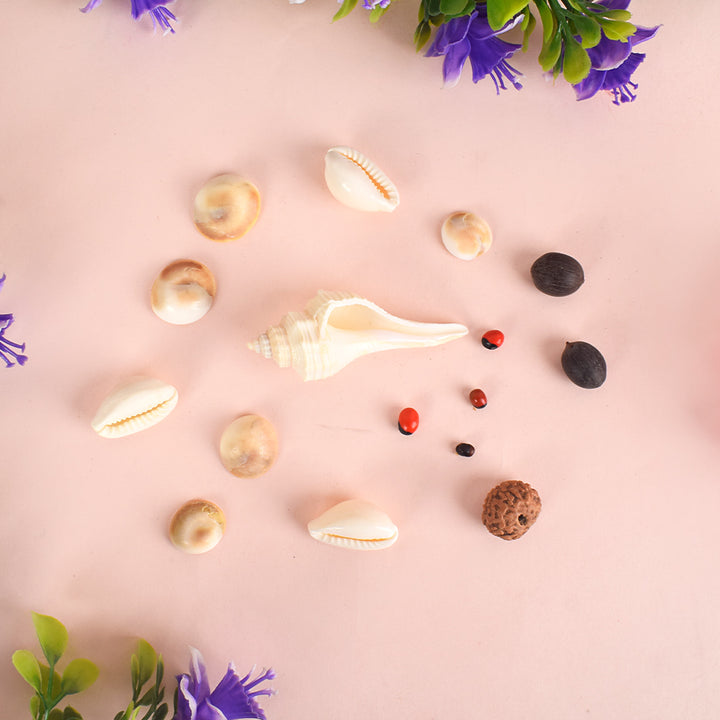 Item Name: Shree Lakshmi Ganesh Yantra Kit with (Shankh, Rudraksha bead, Kamal Gatta bead, Gunja Bead, Kodi, Gomti Chakra)