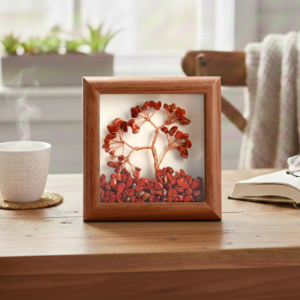 About the Product: The Red Jasper Tree with Frame is a grounding healing stone dΓ©cor piece designed to bring strength, stability, and protective energy into your space. Crafted with natural Red Jasper crystal chips arranged in a tree formation, this framed artwork symbolizes endurance, courage, and rooted energy.
